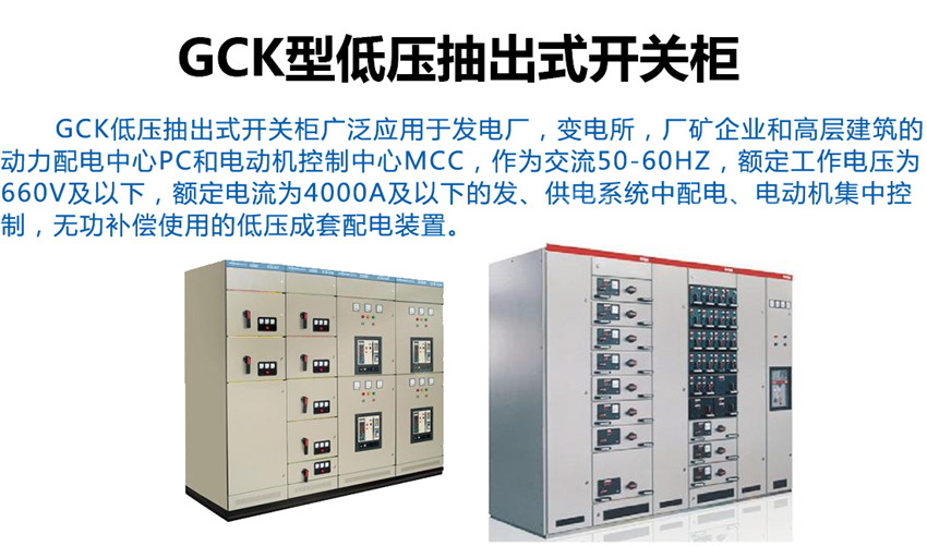 GCK-低壓抽出式開關(guān)柜適用于發(fā)電廠、冶金、石油化工、輕工紡織、港口碼頭、大樓賓館等場所作為交流三相四線或五線制、電壓380V、頻率50H2電力系統(tǒng)的配電和電動(dòng)機(jī)控制之用。